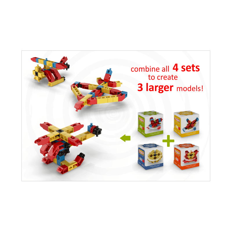 Z každého setu môže byť vytvorený 1 model – točiaci spinner a keď sa skombinujú všetky 4 sety dajú sa zmontovať 3 modely: 2 lietadlá a helikoptéra!