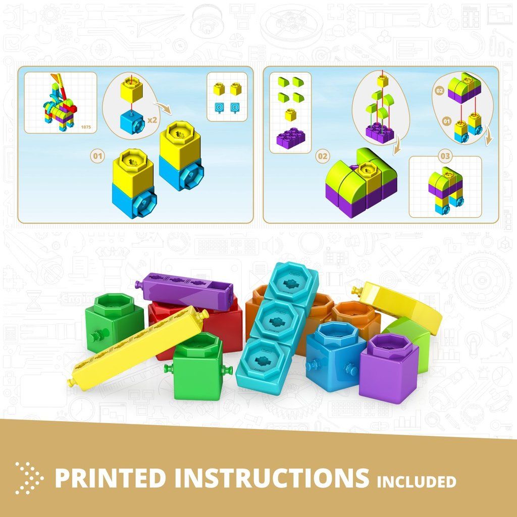 Malí stavitelia strávia hodiny kreatívnej zábavy so stavebnicou Qboidz 30v1 Multimodely. Zároveň zlepšujú koordináciu rúk a očí a priestorové myslenie pomocou našich farebných, ľahko manipulovateľných blokov, tyčí a konektorov. Vytvorte až 30 rôznych úžasných modelov zvierat, vozidiel a lodí s touto viac modelovou STEM stavebnicou. Nájdete tu napríklad vlak, vodný mlyn, robota, sovu, slona, farmu a mnoho ďalších. Keď skončíte s ich stavbou, rozoberte ich a znova postavte!