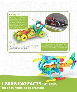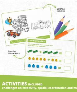 Stavebnica obsahuje knižku, kde nájdete zaujímavé fakty o hlavnom modeli (pretekárske auto) plus aktivity ako kreslenie a počítanie.