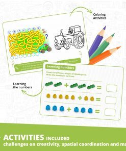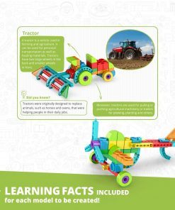 Stavebnica obsahuje knižku, kde nájdete zaujímavé fakty o hlavnom modeli (traktor) plus aktivity ako kreslenie a počítanie.
